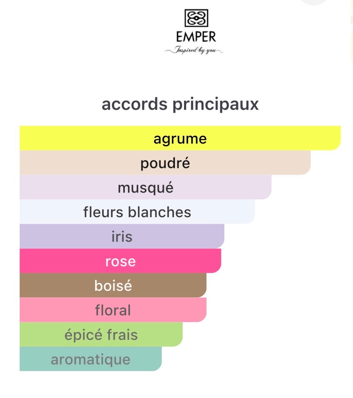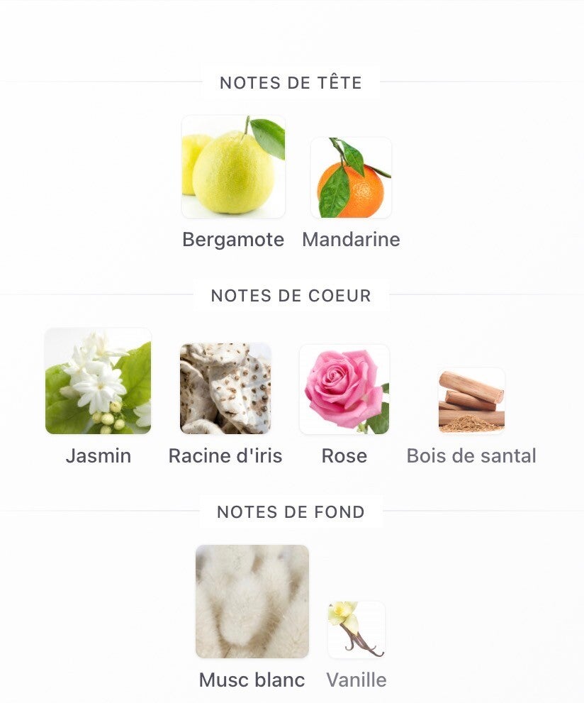 Les notes de coeur sont Jasmin, Racine d'iris, Rose et Bois de santal
