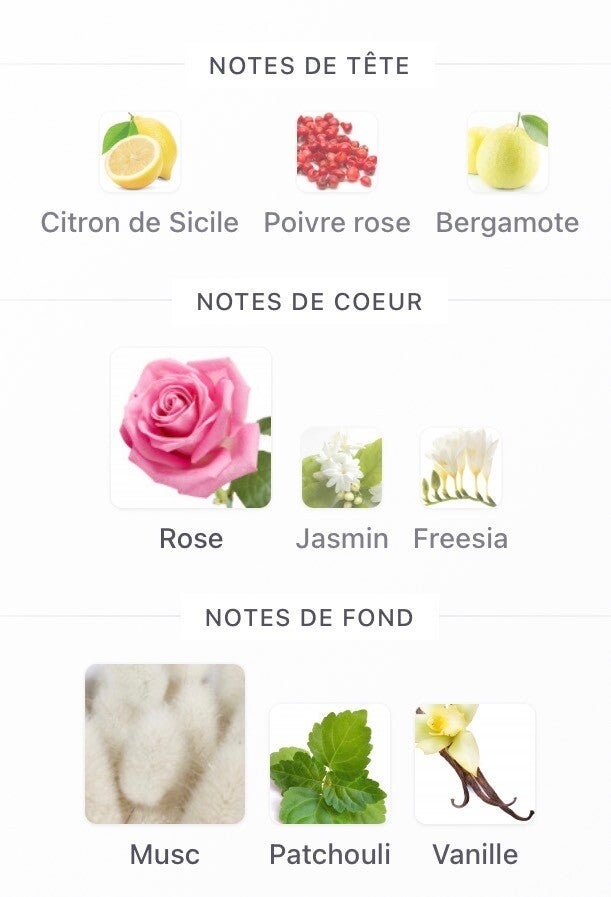 Les notes de coeur sont Rose, Jasmin et Freesia